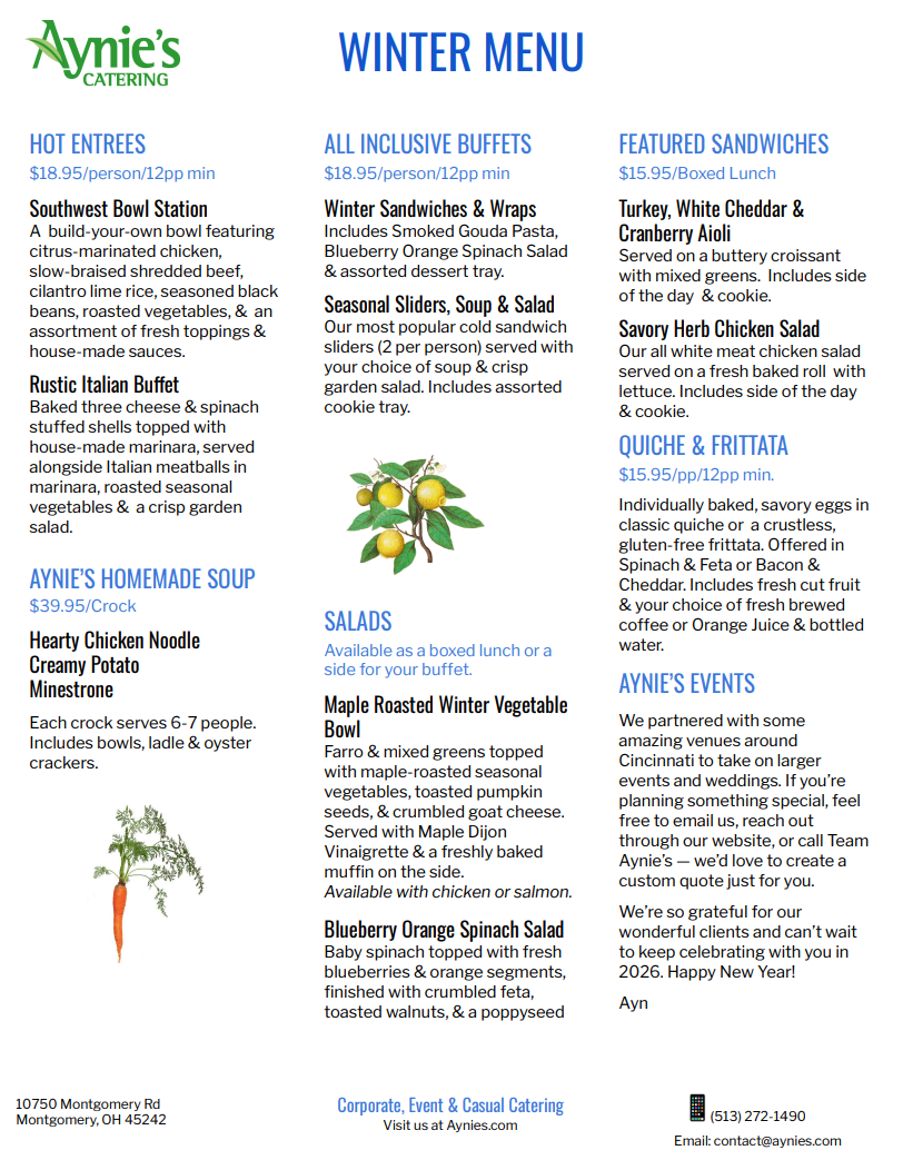 Aynie’s Catering is a locally owned and operated Cincinnati catering company with over 20 years of experience delivering exceptional food and service. We specialize in wedding catering, corporate catering, business events, and private parties , creating memorable dining experiences for events of every size and style.