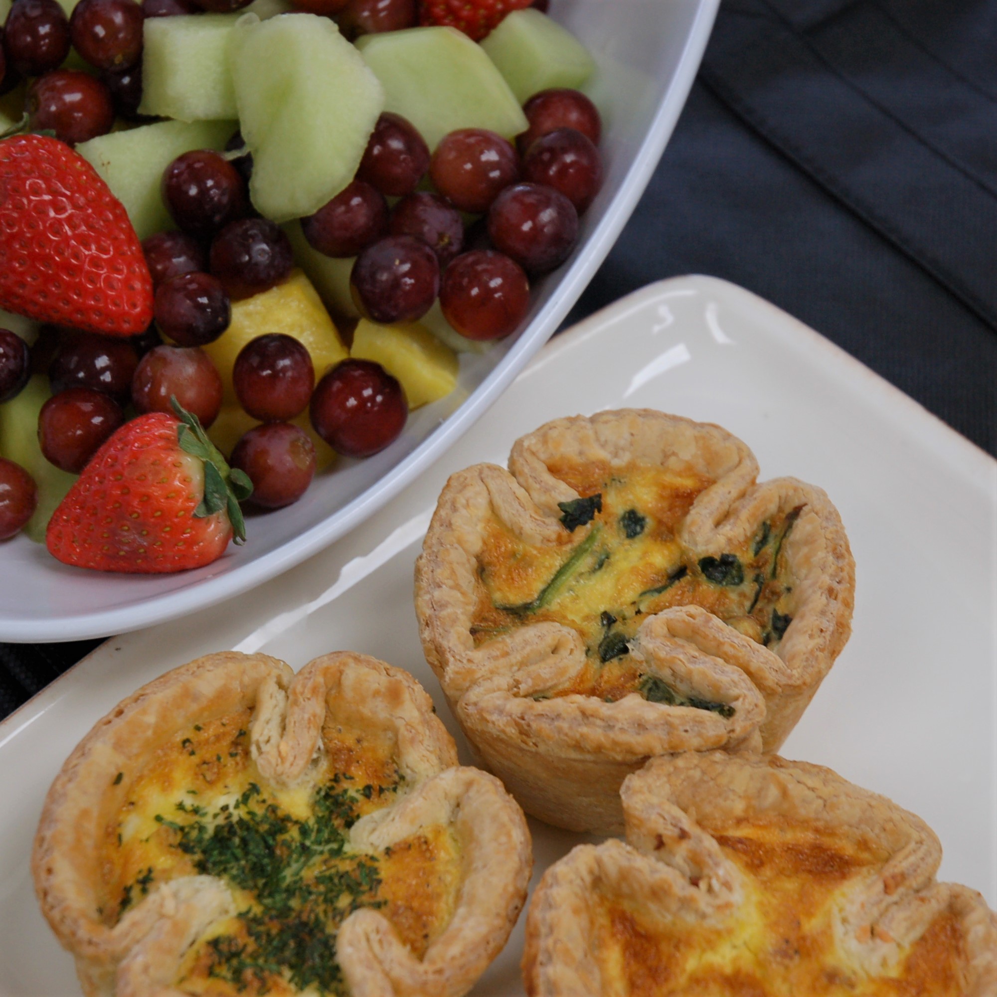 Quiche/ Frittata – Individually baked Quiche / Frittata (GF option) with fresh cut fruit, juice/bottled water and coffee.
