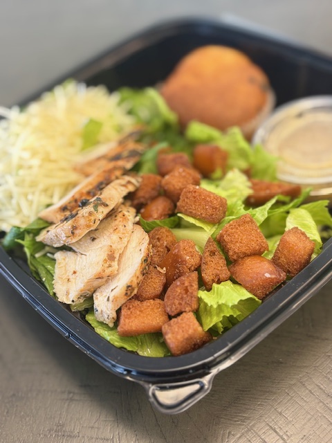 Crisp romaine lettuce, homemade croutons, & parmesan cheese. Available with chicken or salmon.