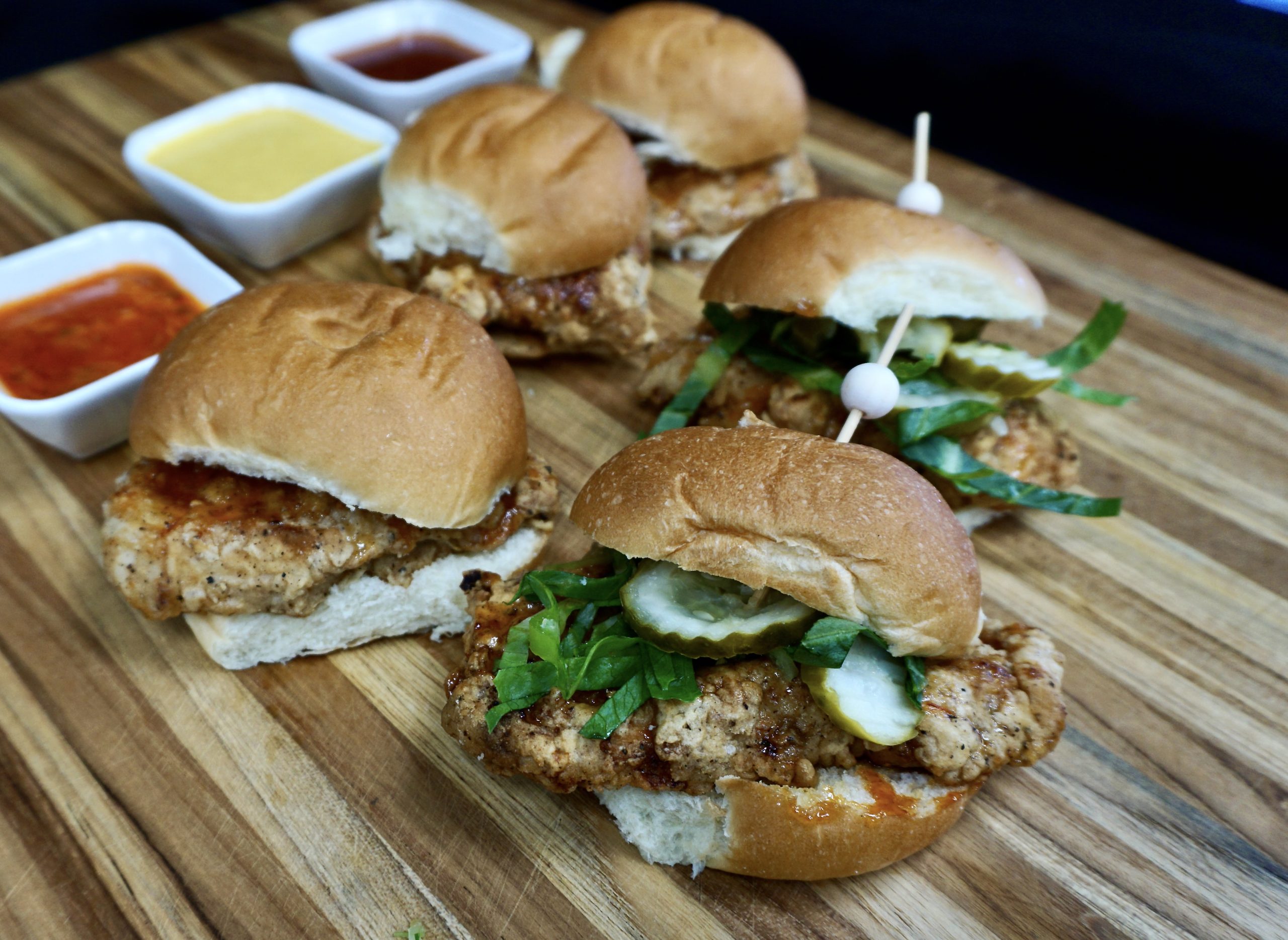 Hand breaded chicken breast sliders with hot honey served on fresh bakery rolls. Includes shredded lettuce, dill pickles and variety of sauces on the side. 18 sliders per order